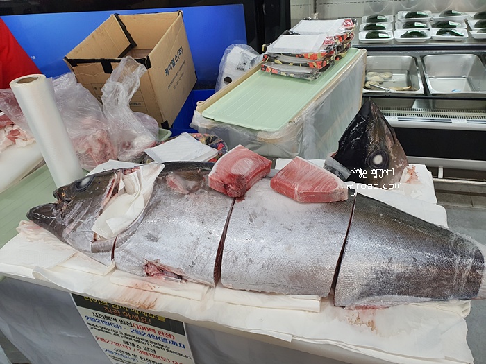 사전 예약도 이미 받은 상태였다. 나만 몰랐어~ 나만! 2월 21일~ 2월 24일까지 사전 예약을 받은 모양이다. 참치 해체쇼는 2월 27일~ 3월 1일이었는데 내가 간 날이 3월1일....그런데 아쉽게 보지 못하고 해체쇼가 끝난 참치 모습만 보게 되었다.