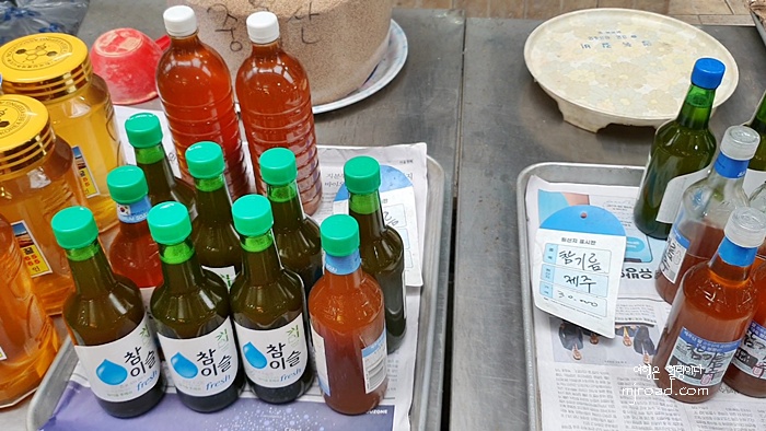 이곳저곳 구경을 재미나게 하고 나오는데 참기름이 눈에 띄었다. 소주병에 담긴 참기름이 재밌다.