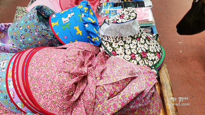 서귀포 매일 올레시장에는 어떤 것들을 주로 팔고 있을까? 조금은 궁금했다. 다른 지역과 차별화가 있을것 같기도 해서 조금은 여유롭게 꼼꼼히 구경하게 되었다. 농사 지을때 앉는 의자는 어딜가나 있을 것 같고 햇볕을 가리는 모자도 여느 시장과 비슷한 컨셉이다.
