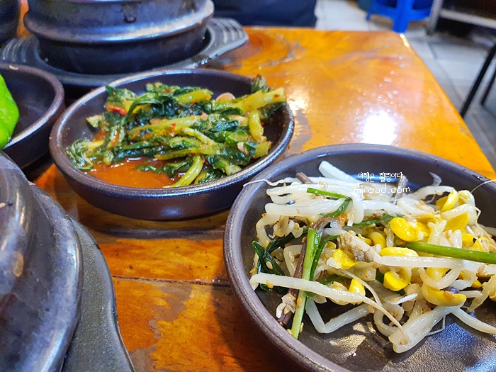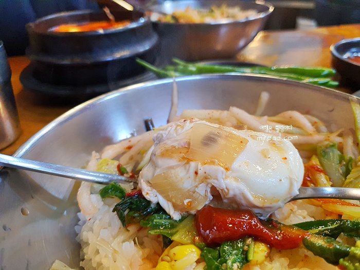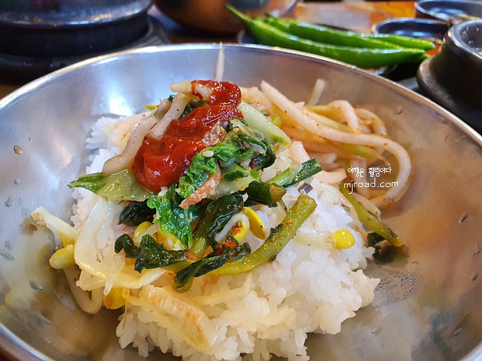 옛날 시골밥상 처럼 푸짐하게 나물반찬류가 나오고 이내 팔팔 끓는 찌개가 나왔다. 밥은 비벼 먹을 수 있게 큰 그릇에 담아 준다. 밥 또한 푸짐하게 퍼 주니 따로 공기밥 추가를 하지 않아도 될 정도다.
