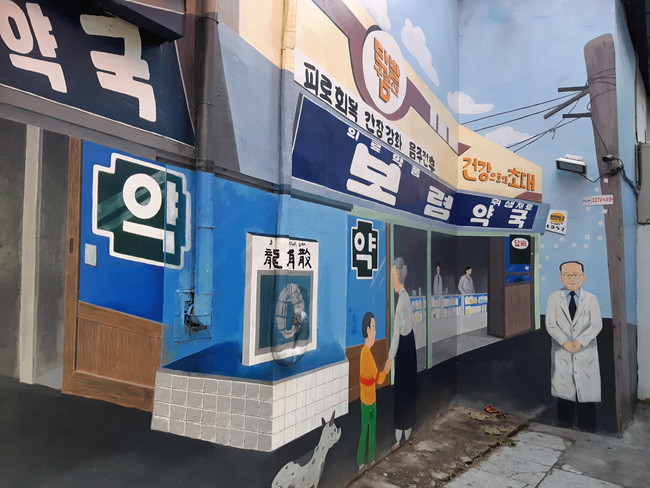 약국 옆 벽에 그림이 그려져 있네요. 마치 옛날 약국의 모습을 보는 듯 시대를 거슬러 올라간 느낌이 들었습니다.