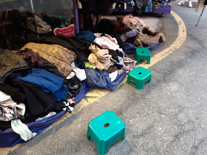 국제시장 곳곳엔 재미난 것들도 볼 수 있는데요.. 오늘은 서울 동묘시장 보다 정말 많이 저렴한 국제시장의 구제의류 사진으로 담아 봤습니다. 국제시장 골목을 거닐다 보면 심심찮게 보게 되는 건 바닥에 놓은 옷들과 목욕탕 의자입니다.
