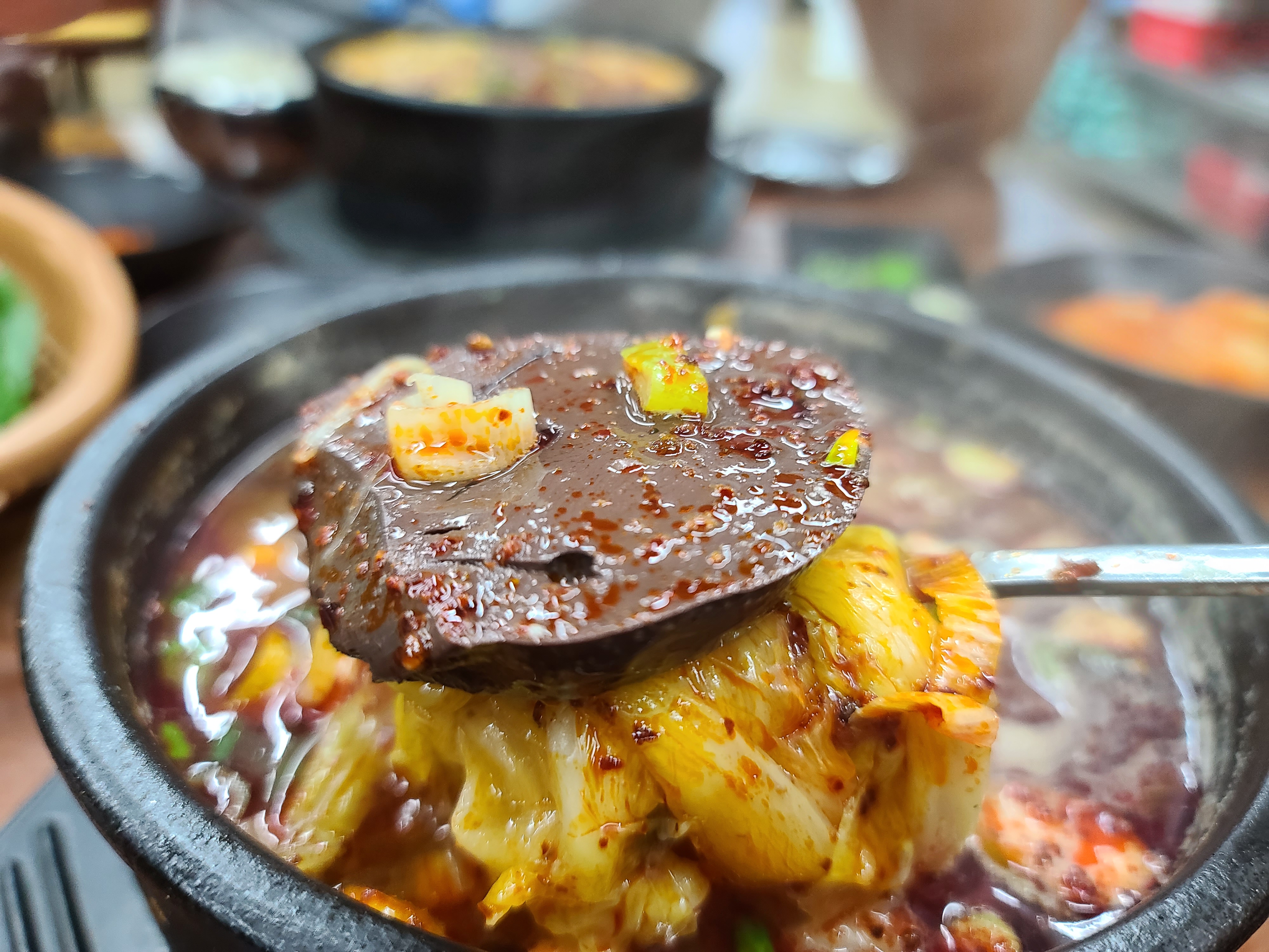 해장국은 선지와 시레기, 고기 그리고 콩나물이 들어가 있다.
