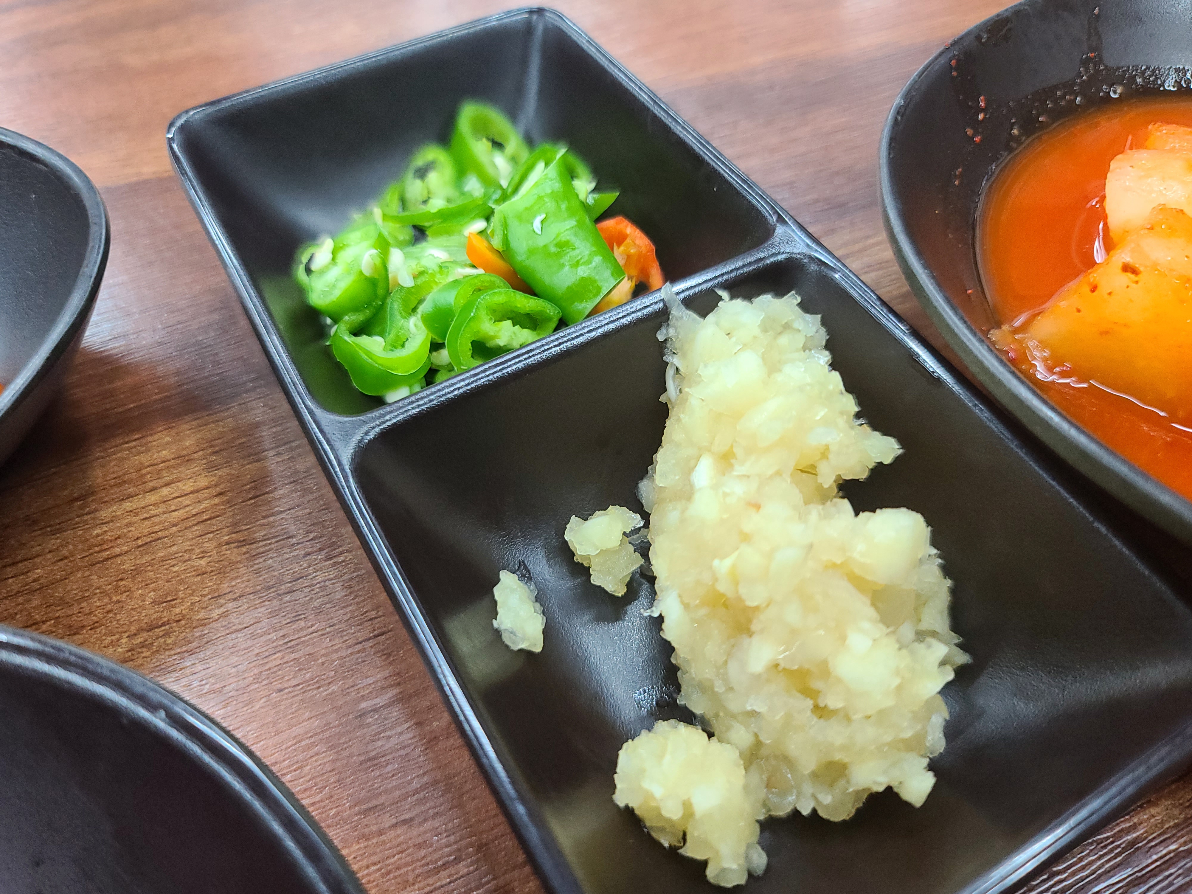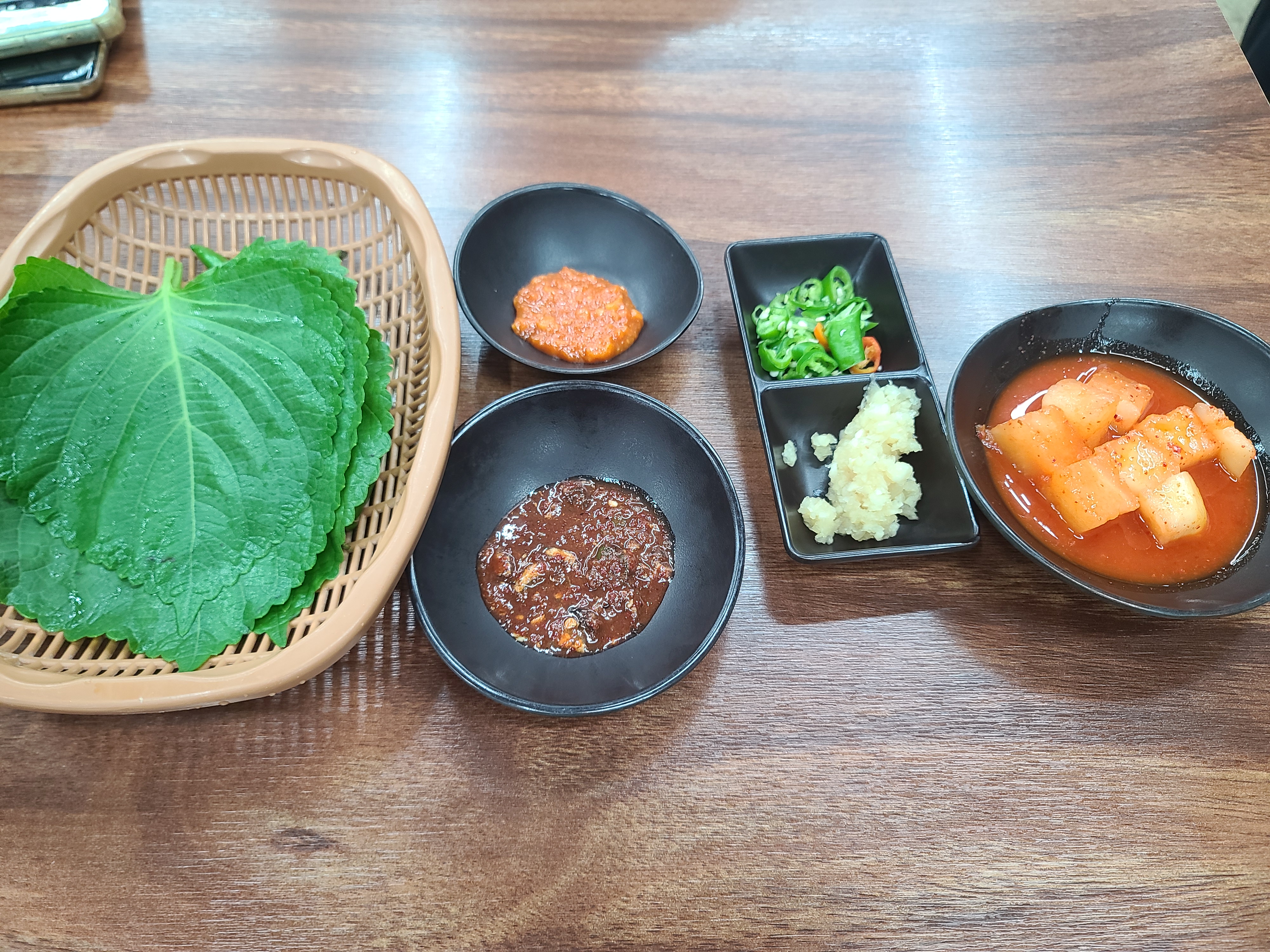 반찬은 깻잎, 멜젓, 고추, 마늘, 깍두기가 나온다.