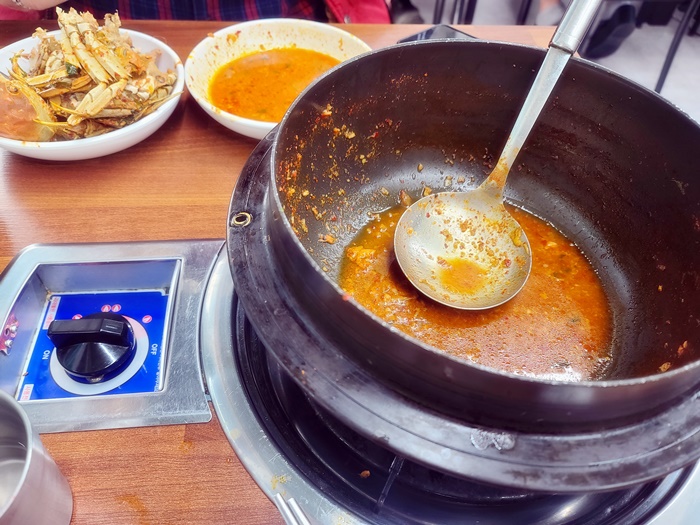먹다 남은 듯한 국물을 국자로 살짝 저어 보니 게와 메기가 함께 들어 있었습니다. 그래서 국물이 그렇게 시원했나 봅니다.