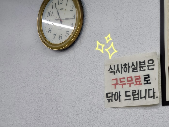 주변에 직장인들이 많아서 손님을 끌어 모으는 팁이 여기에 딱 있더라고요. 식사를 하는 분들은 구두를 무료로 닦을 수 있어요. 식사를 하고 있으면 구두 닦아주는 분이 오셔서 구두를 수거해 가서 닦아서 다시 가져다줍니다. 완전 서비스 굿뜨! 구두 신고 가시는 분은 득템 하는 느낌이 들 거예요.