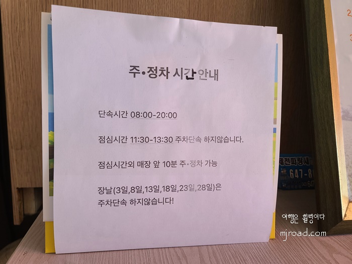 시골이라 장날은 주차단속을 하지 않는다고 하니 참고하길..... 보통 점심시간에는 11시 30분 부터 1시 30분까지 주차단속을 하지 않는다. 도심을 제외하고 이건 잘 만들어 놓은 것 같다. 뭐든 유동성 있게 사는 것도 서로를 위한 일이니까....참고로 장이 열리는 시장은 바로 옆이라 장날 구경하러 가는 것도 재미 있을 듯 하다.