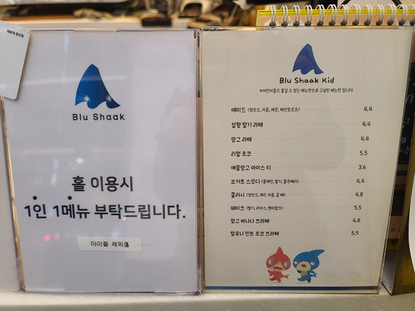 커피 메뉴를 자세히 보다보니 아이들도 즐길 수 있는 메뉴가 따로 이렇게 있더라고요. 사실 여느 커피숍에도 이런 메뉴들이 있긴 하지만 이렇게 적어 놓으니 키즈존 카페 같은 느낌도 많이 들고 아이들도 부담없이 차 한 잔 시킬수 있겠다라는 생각이 들긴 했어요. 이런 것도 나름대로 아이디어 메뉴판이잖아요. 다른 커피숍도 이렇게 해 놓으면 아이들과 함께 온 손님들이 눈여겨 보고 따라 부담없이 주문하실 듯 해요.