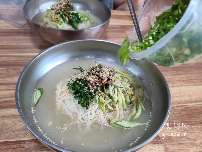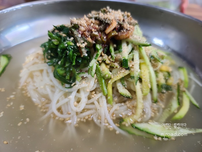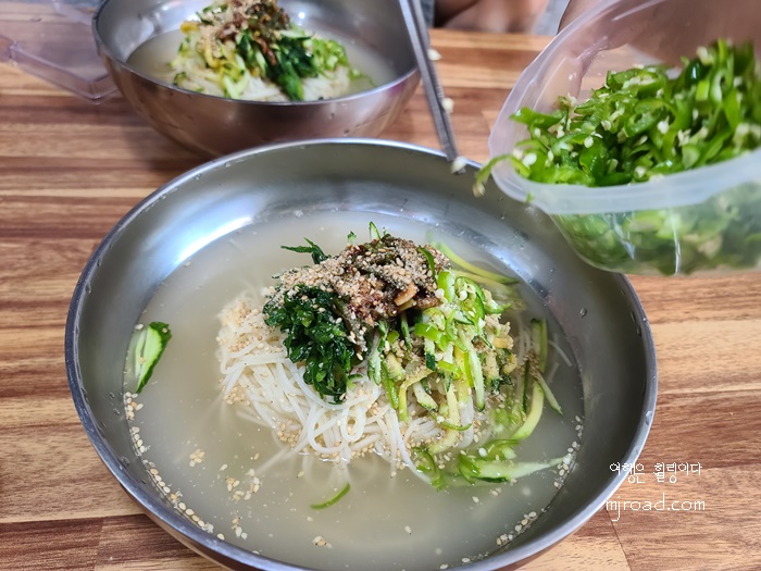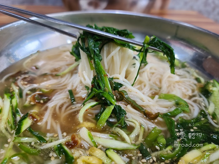 처음 국수를 접하자 마자 어디서 많이 본 듯한 국수 비주얼이다. 잠시 생각해 보니 ' 맞다! ' 이 국수의 비주얼은 어릴적 엄마가 해 주셨던 국수의 모습과 흡사했다. 삶아 양념한 부추와 호박을 고명으로 올린 것을 보니 어김없이 경상도 스타일이다.