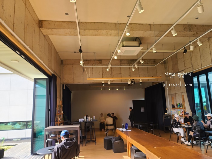 카페 안쪽으로 들어가면 카운터가 바로 나오고 그 옆으로 넓은 무대와 실내가 보인다. 사실 눈에 제일 먼저 띈 것은 무대였다. 내가 갔을 때는 연극 연습을 하는 모습이었고 손님들은 그런 모습을 커피를 마시며 자연스럽게 볼 수 있는 이색카페였다.