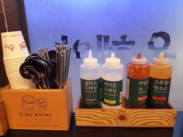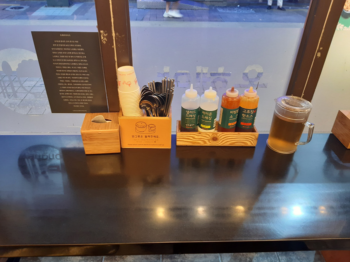 소스 종류도 다양하게 비치되어 있습니다. 원하는 소스를 넣어 먹는 즐거움도 가미되네요.