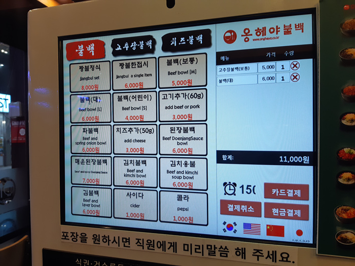 원하는 메뉴를 선택해 카드를 넣어 결재합니다. 현금이나 포장은 직원에게 따로 말을 해야 합니다.