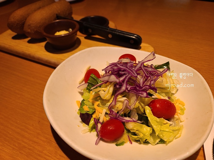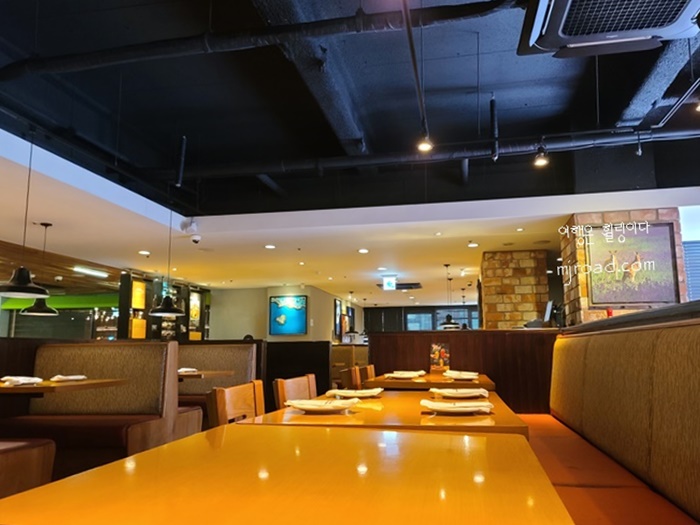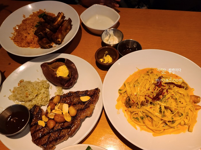 보통 낮에가면 특선 메뉴들로 주문하면 크게 부담스럽지 않다. 고기, 파스타, 샐러드, 음료가 나오기 때문이다. 우린 보통 이곳에 가면 각종 할인을 많이 받아서 거의 30% 할인된 가격에 식사를 하고 오는 편이다. 다른 체인점과 달리 너무 어두운 조명 때문에 음식 사진이 그렇게 맛나 보이지 않아 보인다. 사실은 그렇지 않은데...
