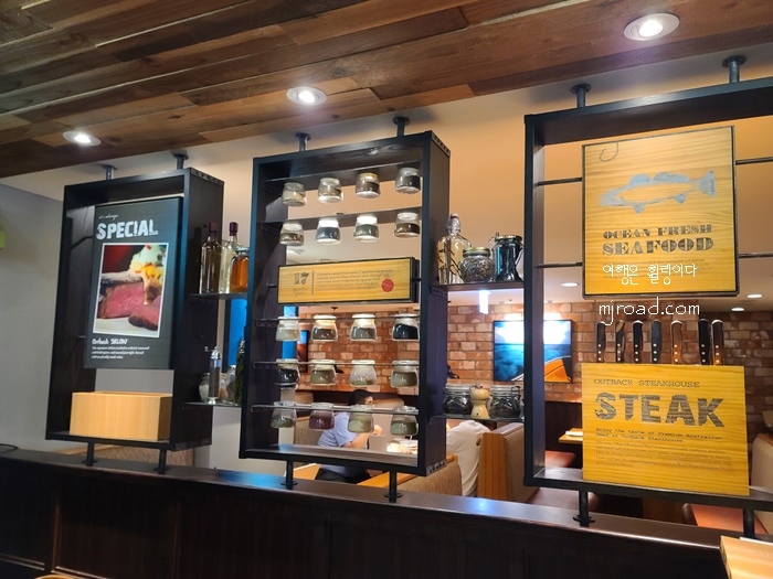 입구에 들어서니 다른 체인점과 달리 너무 어두침침 했다. 마치 외국의 한 스테이크집처럼 말이다. 보통 아웃백 스테이크 하우스는 밝고 넓은 분위기가 대부분인데 이곳은 조금 많이 달랐다. 처음엔 조명을 많이 안 켰는지 하는 착각까지 들었다.