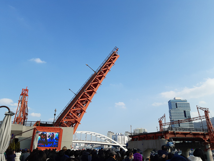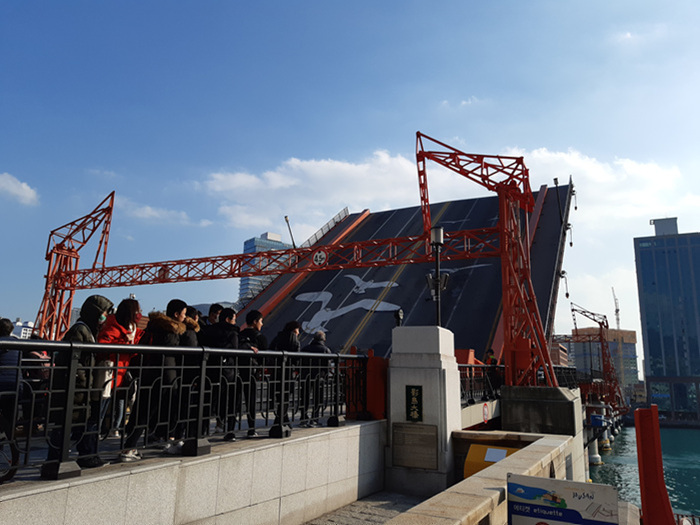 영도다리가 올라가는 모습을 촬영하는 외국인 관광객들과 국내 관광객들