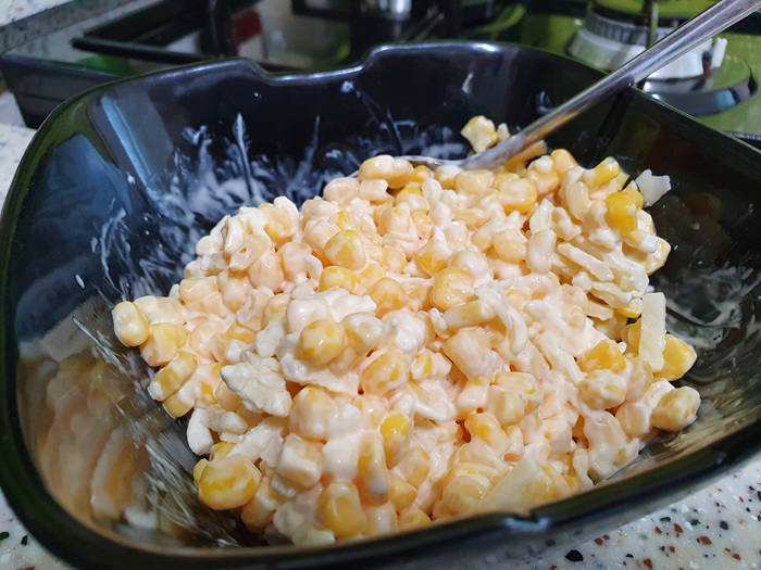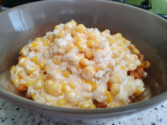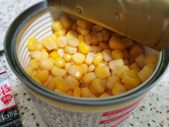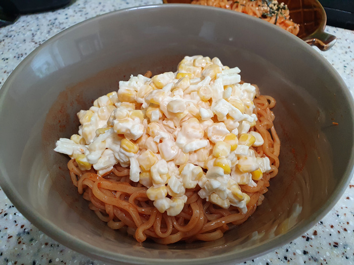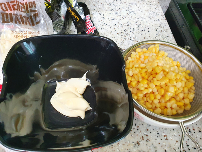 볶음면을 준비하는 동안 모짜렐라치즈, 마요네즈, 설탕, 옥수수를 넣고 버무려 줍니다. 비율은 라면이 2개니까 각각 2스푼씩...
