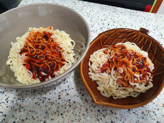 면에 양념을 넣고 버무리는데 갑자기 그냥 비빔면만 먹고 싶어서 한쪽에만 넣기로 했습니다.