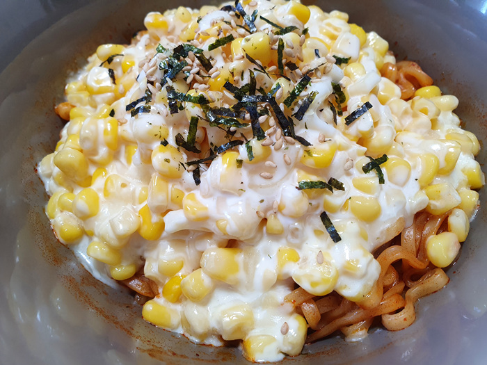 볶음면을 준비하는 동안 모짜렐라치즈, 마요네즈, 설탕, 옥수수를 넣고 버무려 줍니다. 비율은 라면이 2개니까 각각 2스푼씩...