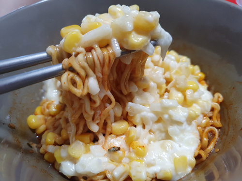불닭 볶음면 1개 (or 불닭 볶음면 컵라면 큰 컵 ), 모짜렐라 치즈, 스위트 콘, 설탕/ 마요네즈