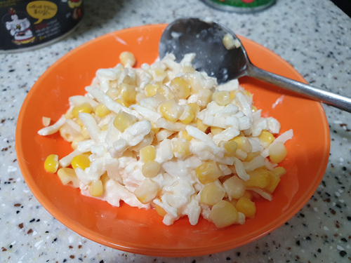 불닭 볶음면이 익을때까지 준비된 모짜렐라 치즈, 마요네즈, 스위트 콘, 설탕 1스푼을 섞어 줍니다.
