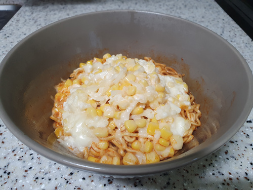 불닭 볶음면 1개 (or 불닭 볶음면 컵라면 큰 컵 ), 모짜렐라 치즈, 스위트 콘, 설탕/ 마요네즈