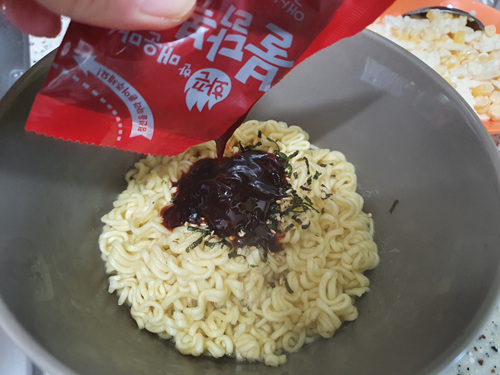물에 다 불려진 면은 그릇에 옮겨 담은 뒤 불닭 소스를 넣고 섞어 줍니다.
