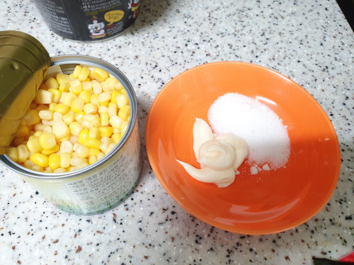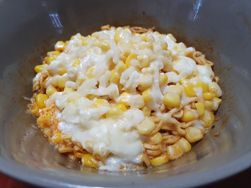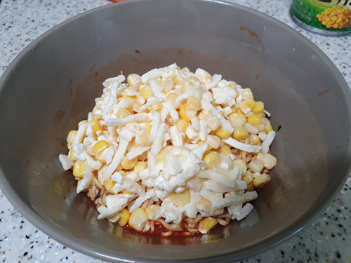 불닭 볶음면이 익을때까지 준비된 모짜렐라 치즈, 마요네즈, 스위트 콘, 설탕 1스푼을 섞어 줍니다.