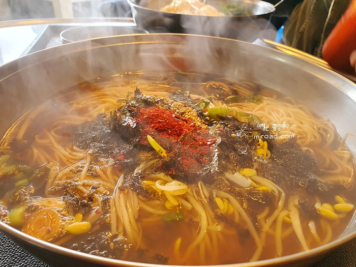 한 20분 정도 기다렸을까... 국수가 나왔다. 선반에 놓여진 국수 1인 분의 양을 비교하면 월등히 적은 양이었다. 그래도 다른 국수집에 비하면 조금 더 많은 양 정도랄까...