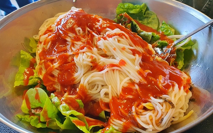 일단, 사진은 가까이서 찍어야 양도 푸짐하고 맛있어 보이니 근접 촬영을 했다. 그런데 국수 면과 콩나물의 두께가 비슷한 것은 뭐임? 한마디로 국수가 너무 불어서 평소 우리가 먹던 국수의 면발과 너무 차이가 났다. 개인적으로 이렇게 불어버린 국수는 별로 좋아하지 않아 많이 실망했다. 비빔국수는 상추와 국수 삶은 것만 나오고 다른 고명은 전혀 없다. 소스는 직접 뿌려 먹어야 한다. 음.... 이 또한 너무 불어버린 국수에 급 실망...