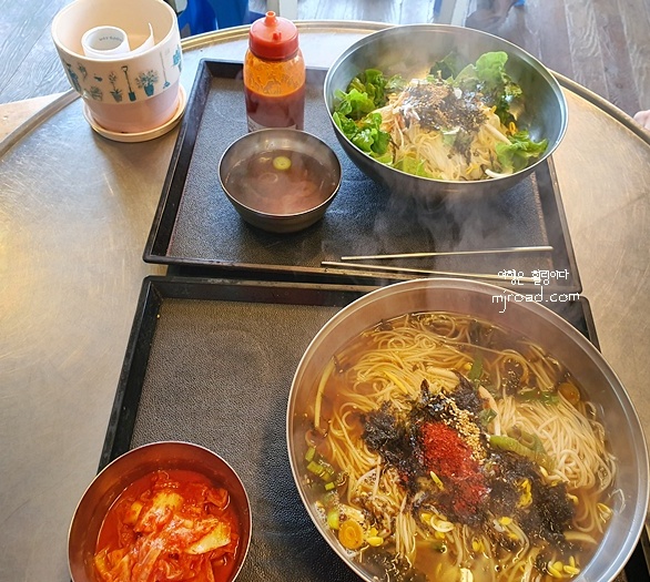 국수 가격은 잔치국수 5,000원 비빔국수 5,000원이다. 콩국수는 겨울에 하지 않고 봄 늦게 하는 것 같았다. 우린 잔치국수 하나랑 비빔국수 하나를 주문했다.