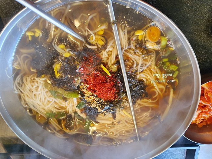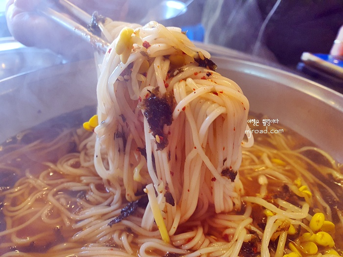 한 20분 정도 기다렸을까... 국수가 나왔다. 선반에 놓여진 국수 1인 분의 양을 비교하면 월등히 적은 양이었다. 그래도 다른 국수집에 비하면 조금 더 많은 양 정도랄까...