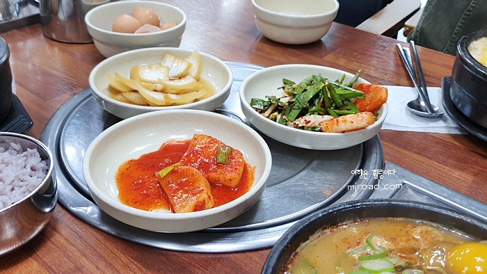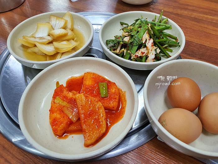 소고기 해장국은 진한 국물로 깔끔한 맛이라고 한다면 내장탕은 진한 국물에 해장하기 딱 좋다. 내장 좋아하는 분은 내장탕 무조건 추천! 반찬은 깍두기, 부추무침, 양파절임이 나온다. 해장국에 이만한 반찬은 없다.
