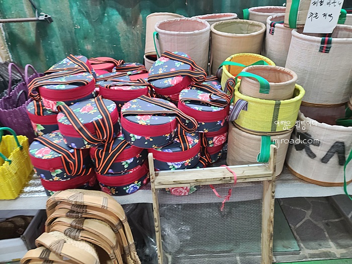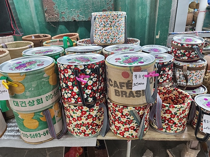 제주시에 있는 오일시장과 달리 이곳은 한적한 시골이라 그런지 꽤나 예스러운 물건들이 유독 눈에 많이 띄었다. 그리고 사용한 비료포대나 커피자루등을 재활용해 이용해 만든 바구니, 가방 등도 직접 만들어 파는 곳도 있었다.