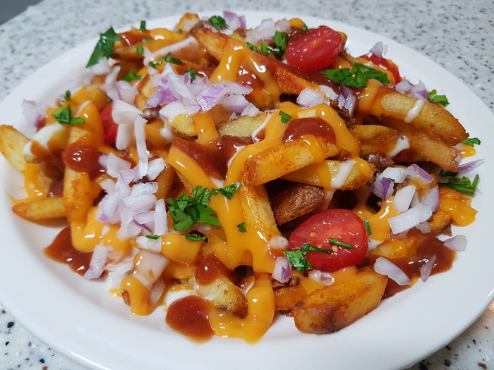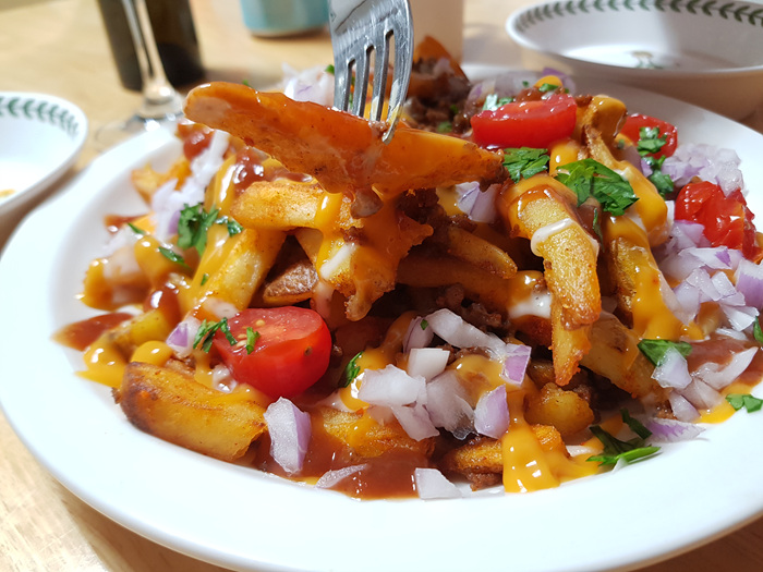 몬스터 치즈프라이 내용물 구성은 이렇습니다. 감자, 쇠고기, 각종 소스 그리고 채소가 들어 있습니다.