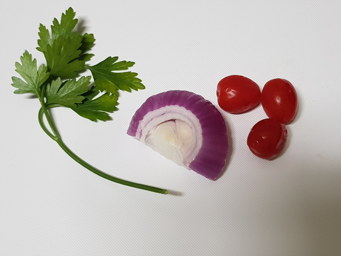 채소는 일단 잘게 다지듯이 썰어 주세요. 이건 요리 후 토핑으로 올라갈 재료입니다.