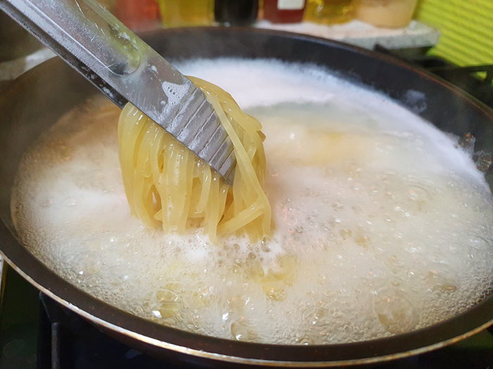 시간을 정확히 지키면 좋겠지만 만약 시간 체크를 하지 않았다면 집게로 들어 면을 확인해 보시면 됩니다.