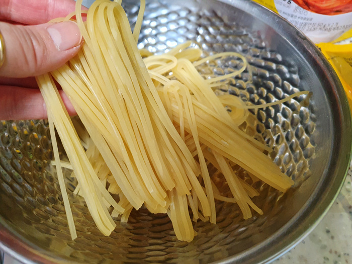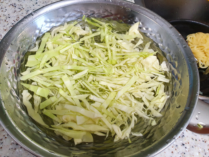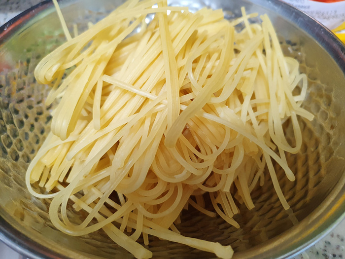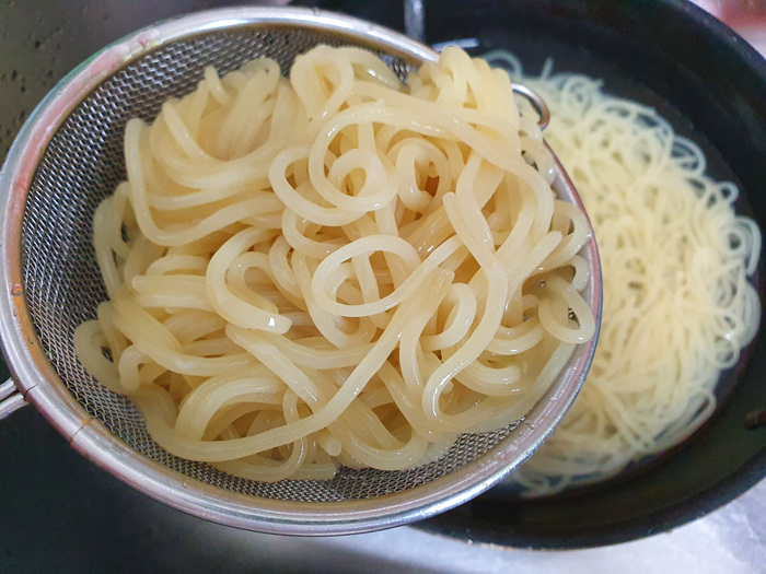 잘 삶아진 쫄면 사리는 찬물에 깨끗이 헹군 뒤 채에 받쳐 물기를 제거합니다.