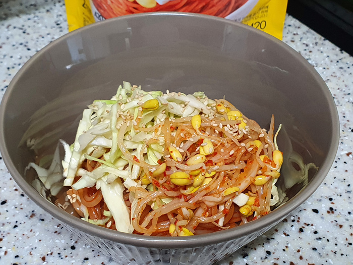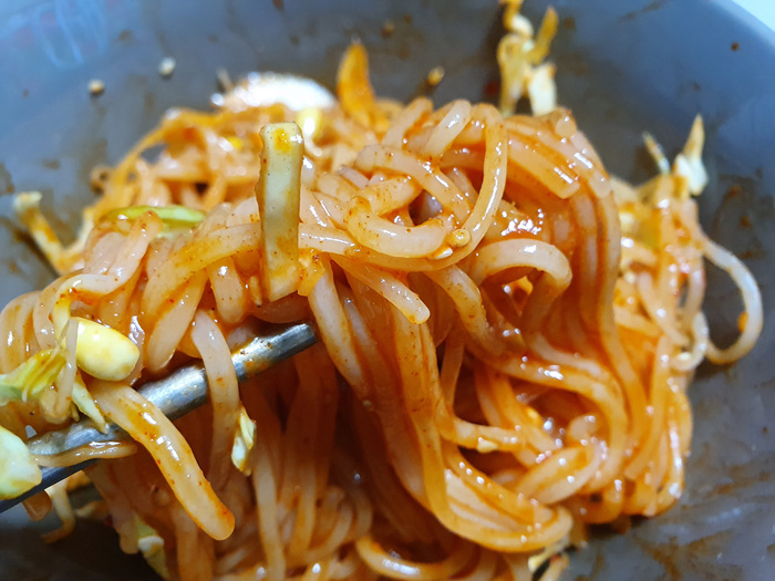생각보다 매콤한 양념에 침샘이 자극되더군요. 각종 채소를 많이 넣어 먹으면 한 끼 식사로 손색이 없을 겁니다. 개인적으로 음식점에서 파는 쫄면 못지않게 너무 맛있어서 놀랐습니다. ^^