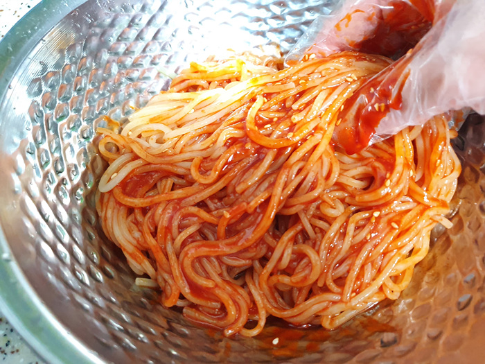 그냥 비빔장을 넣어 비벼 먹어도 맛있지만 각종 채소를 넣어 같이 비벼 먹으면 맛이 배가 됩니다. 전 양배추와 콩나물무침을 넣어 같이 먹었어요.