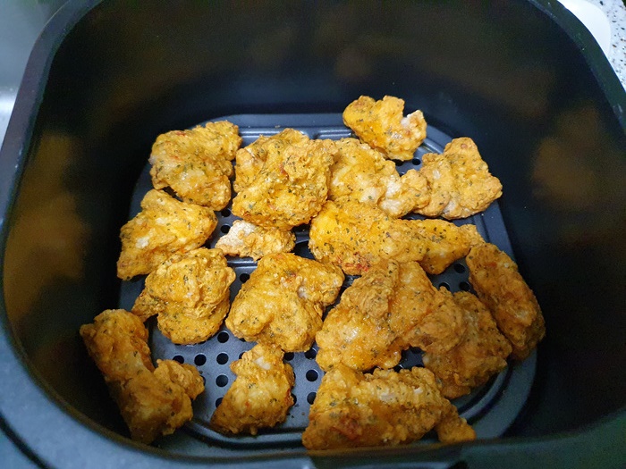 냉동된 치킨을 예열된 에어프라이어에 넣고 180도 온도에서 15분 조리합니다. 이때 중요한 것은 7~8분 시간이 지나면 뒤집어서 구워 주어야 한다는 점이죠.