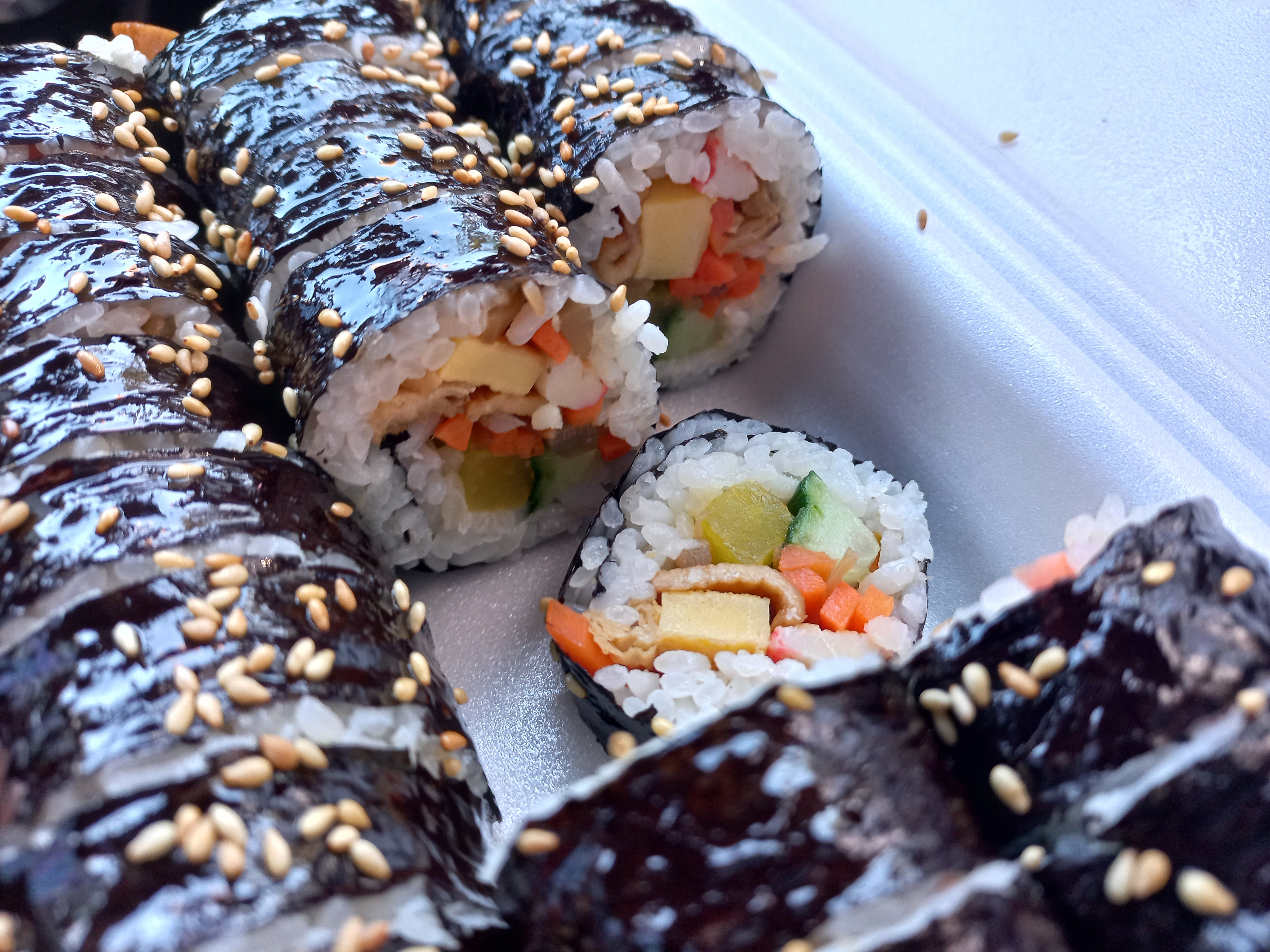 당근, 어묵, 맛살, 오이, 우엉, 단무지등이 들어 있어요. 기본 김밥이라고 하기엔 정말 알찹니다.