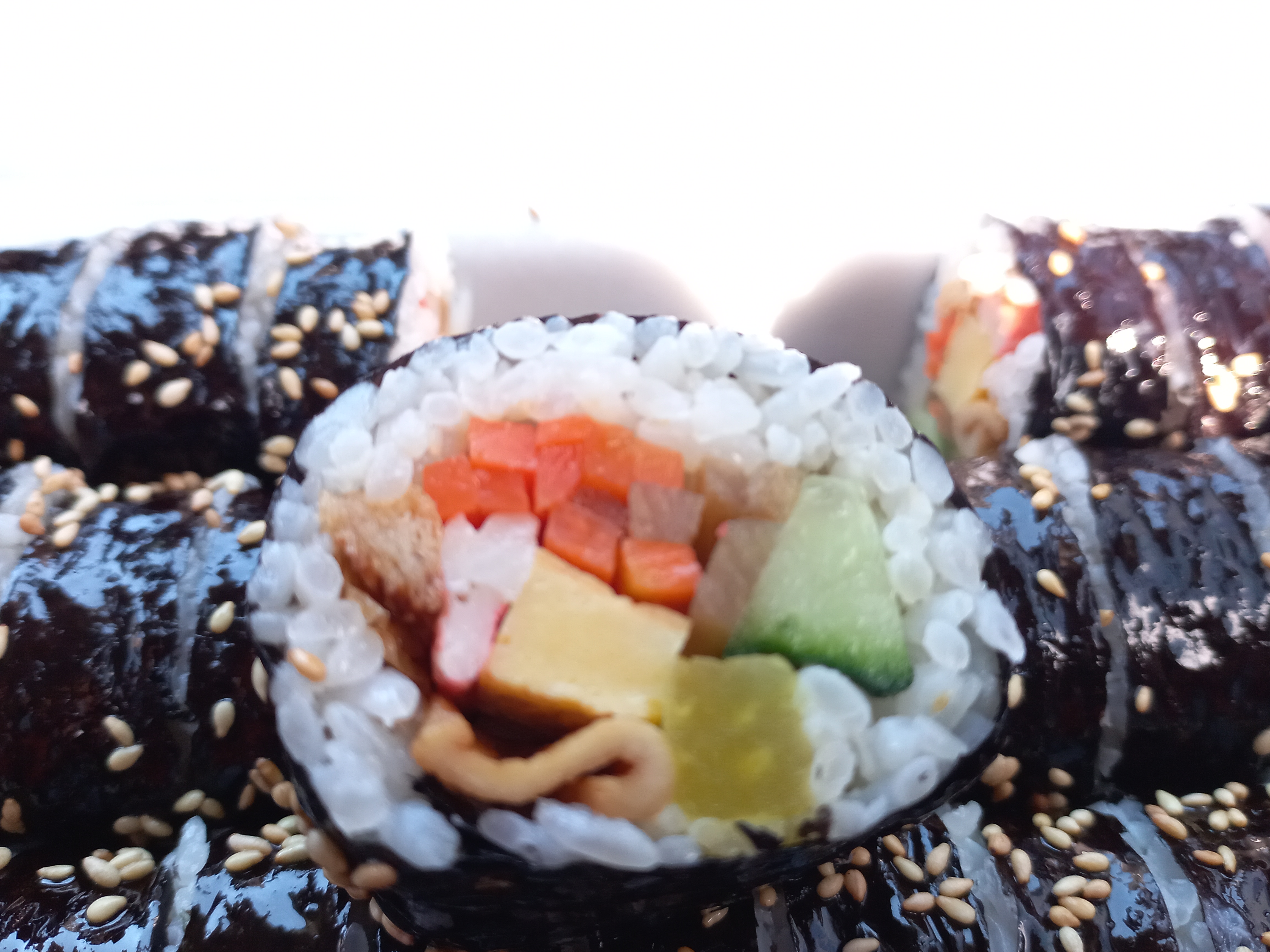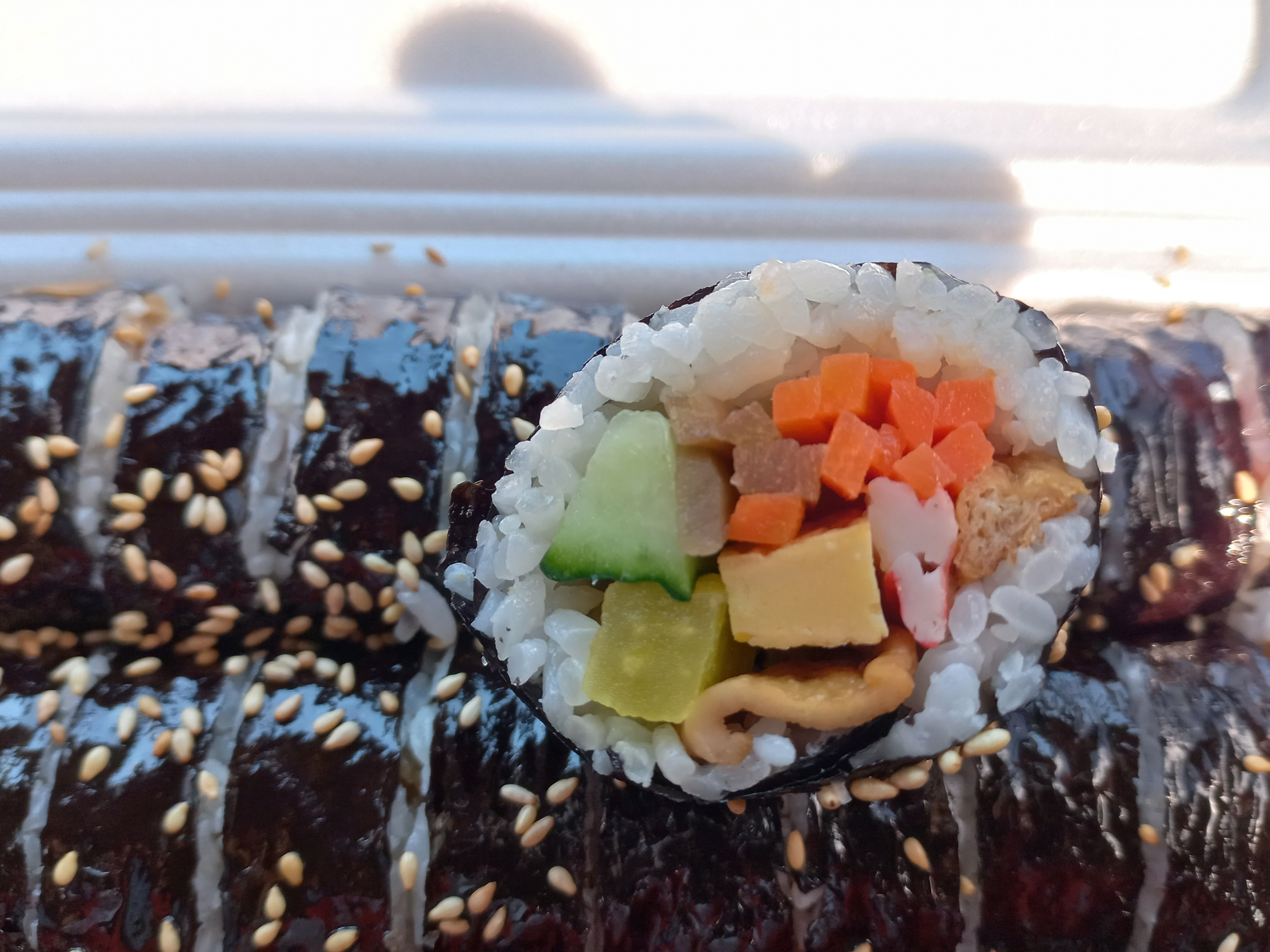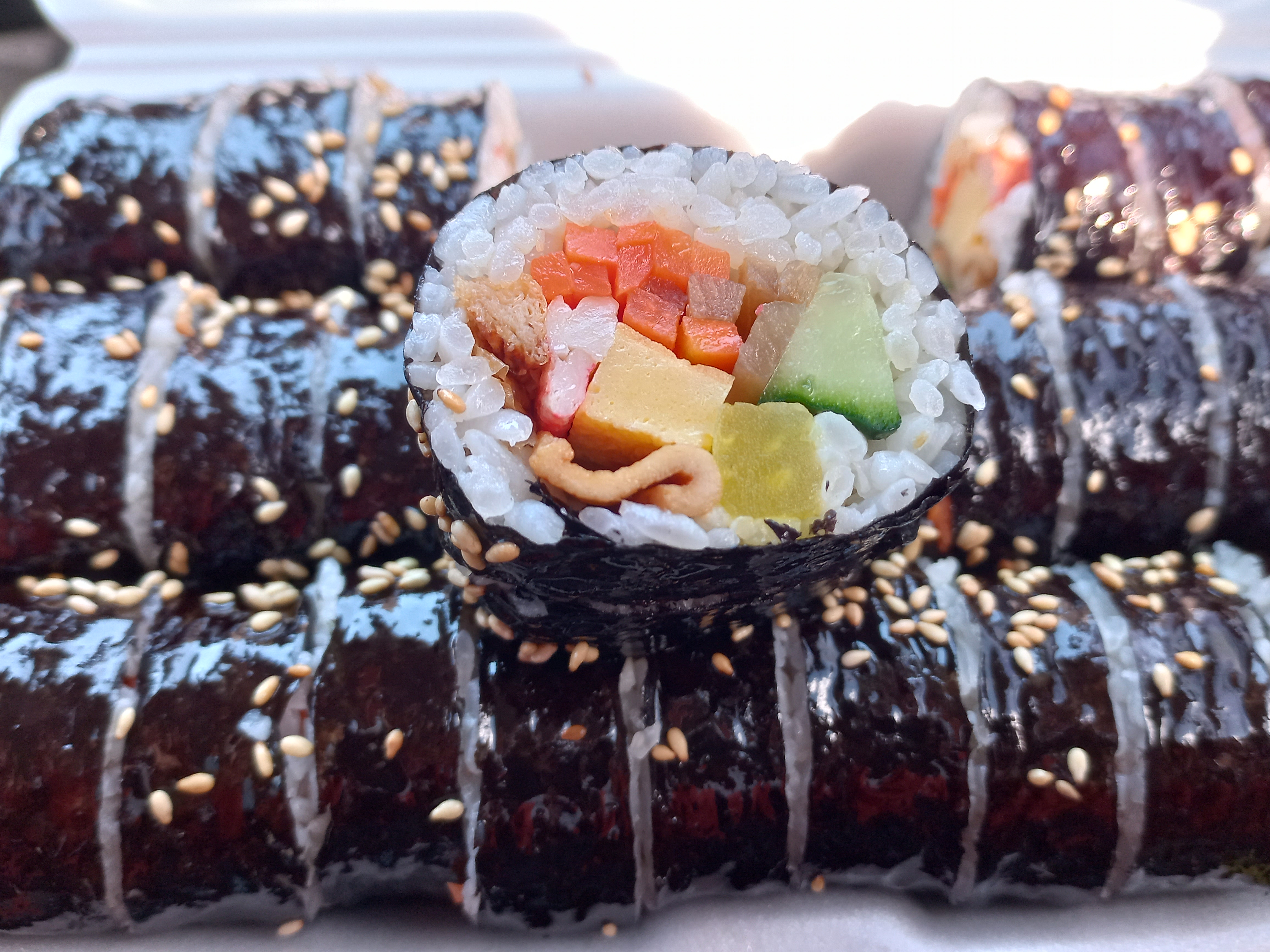 당근, 어묵, 맛살, 오이, 우엉, 단무지등이 들어 있어요. 기본 김밥이라고 하기엔 정말 알찹니다.