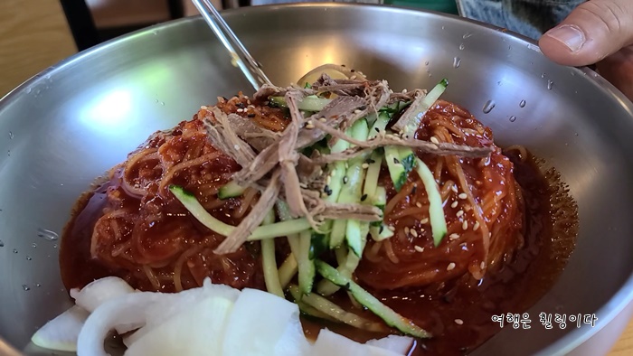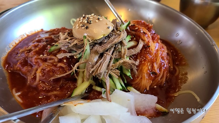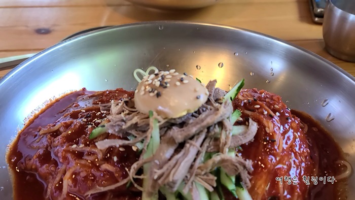 작년에는 비빔 밀면 고명에 닭을 올려 주었는데 이번엔 양지살을 올려 주더라고요. 그래서 가격이 조금 올랐나 싶기도 했어요. 양은 작년이나 올해나 변함이 없습니다. 어떤가요. 정말 푸짐하죠. 이게 바로 8,500원 비빔밀면 비주얼입니다.