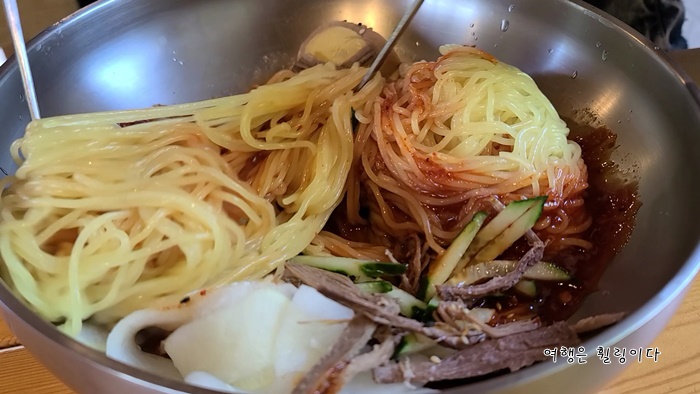 작년에는 비빔 밀면 고명에 닭을 올려 주었는데 이번엔 양지살을 올려 주더라고요. 그래서 가격이 조금 올랐나 싶기도 했어요. 양은 작년이나 올해나 변함이 없습니다. 어떤가요. 정말 푸짐하죠. 이게 바로 8,500원 비빔밀면 비주얼입니다.