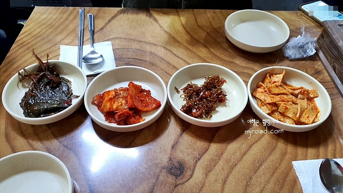 반찬은 4종류가 나온다. 깻잎지와 김치 그리고 멸치반찬과 어묵반찬이다.