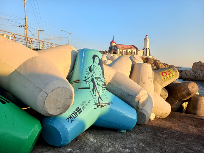 회색빛 방파제 구조물이면 왠지 삭막한 느낌도 없지 않아 있었는데 이렇게 눈에 띄는 색에 그림까지 그려져 있으니 조금은 안전상 그 주위에 올라가지 않을 듯도 합니다.
