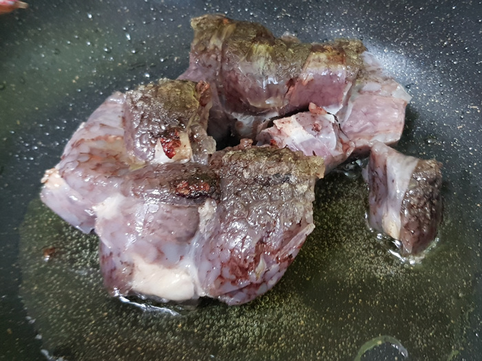조리 레시피대로 따라하면 기름을 두르고 순대를 넣어 먼저 볶는데요. 이때 사진과 달리 순대가 잘 떨어지지 않아 적잖게 당황했습니다. 물론 불 조절도 약불로 그렇게 세지 않았음에도 말이죠.. ㅡㅡ;;;;