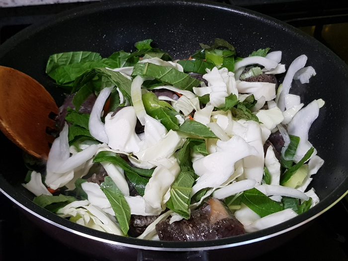 순대를 볶은 후에는 각종 채소를 넣고 한 번 더 볶아 줍니다. 채소가 숨이 조금 죽을때쯤에 양념을 넣어 한 번 더 볶아주면 됩니다.