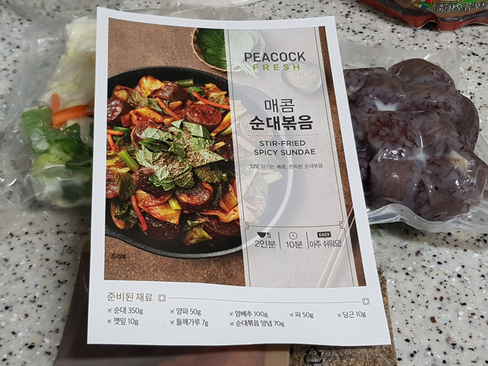 이마트에서 요즘 인기만점이 코너가 바로 피코크 밀키트 제품을 파는 곳이 아닐까 하는 생각이 듭니다. 조금 늦게라도 가면 원하는 제품이 없을 정도니까요. 그나마 다행인 것은 순대볶음이 있어 구입해 와 저녁에 간단히 해 먹기로 했습니다.