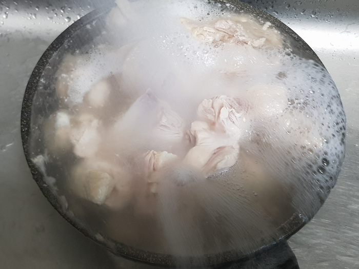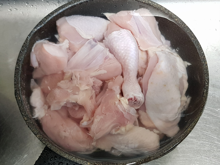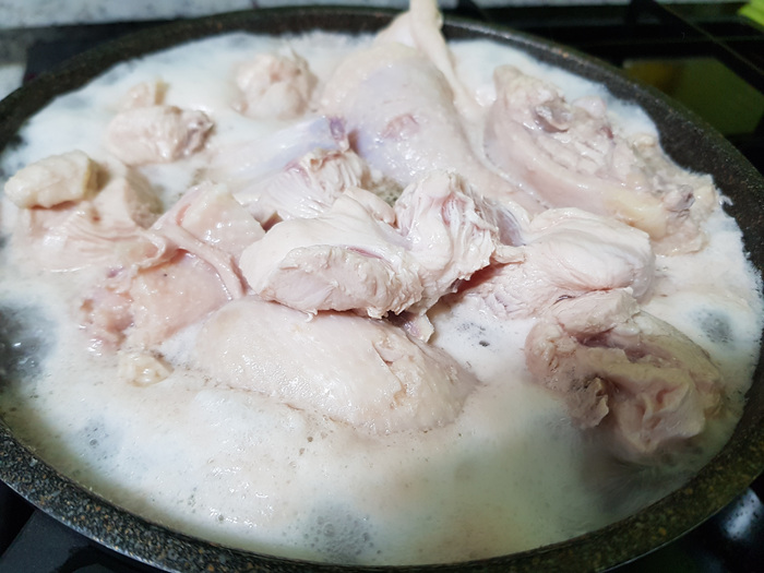 삶은 물은 버리고 닭만 냄비에 담았습니다.